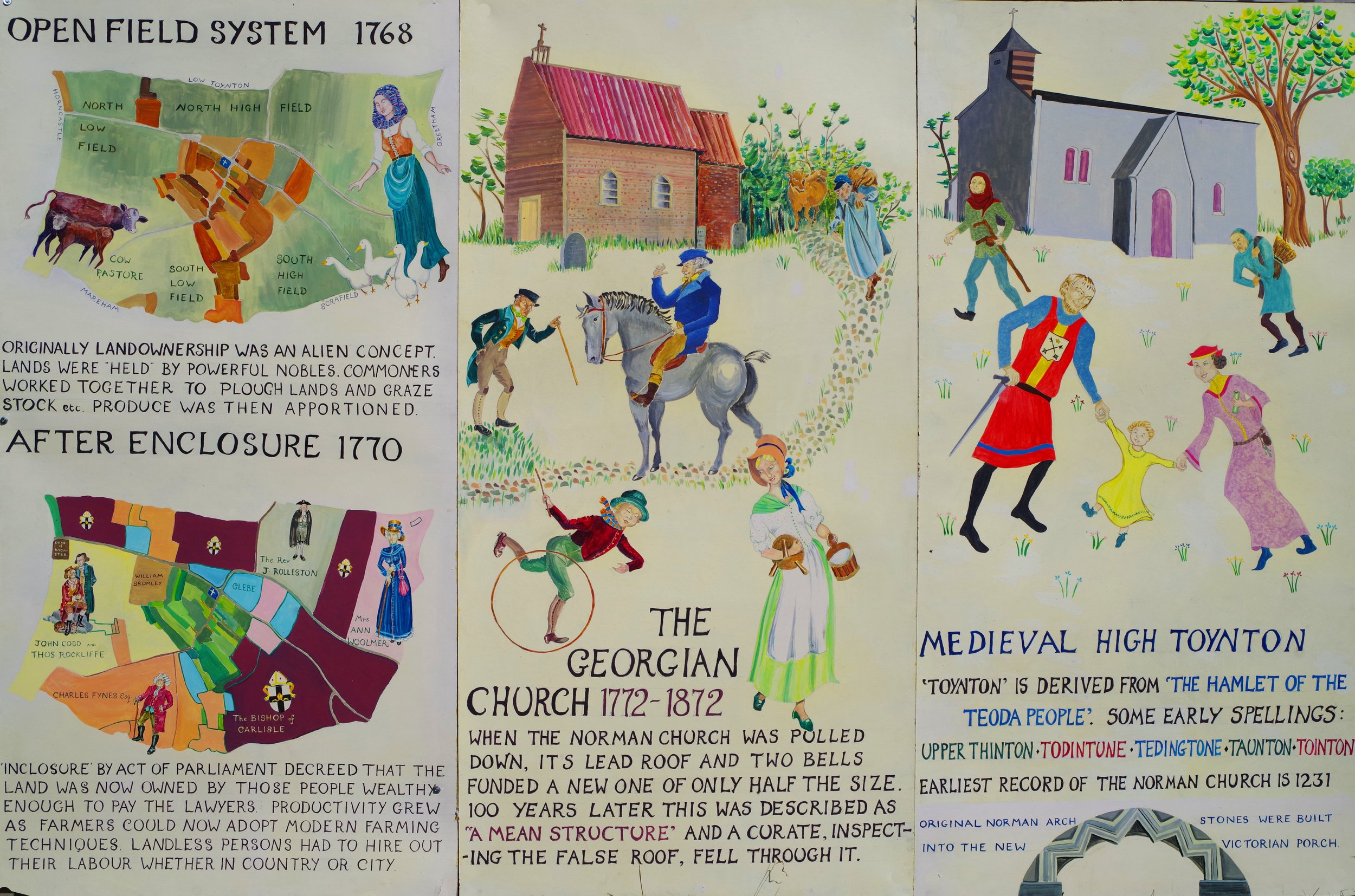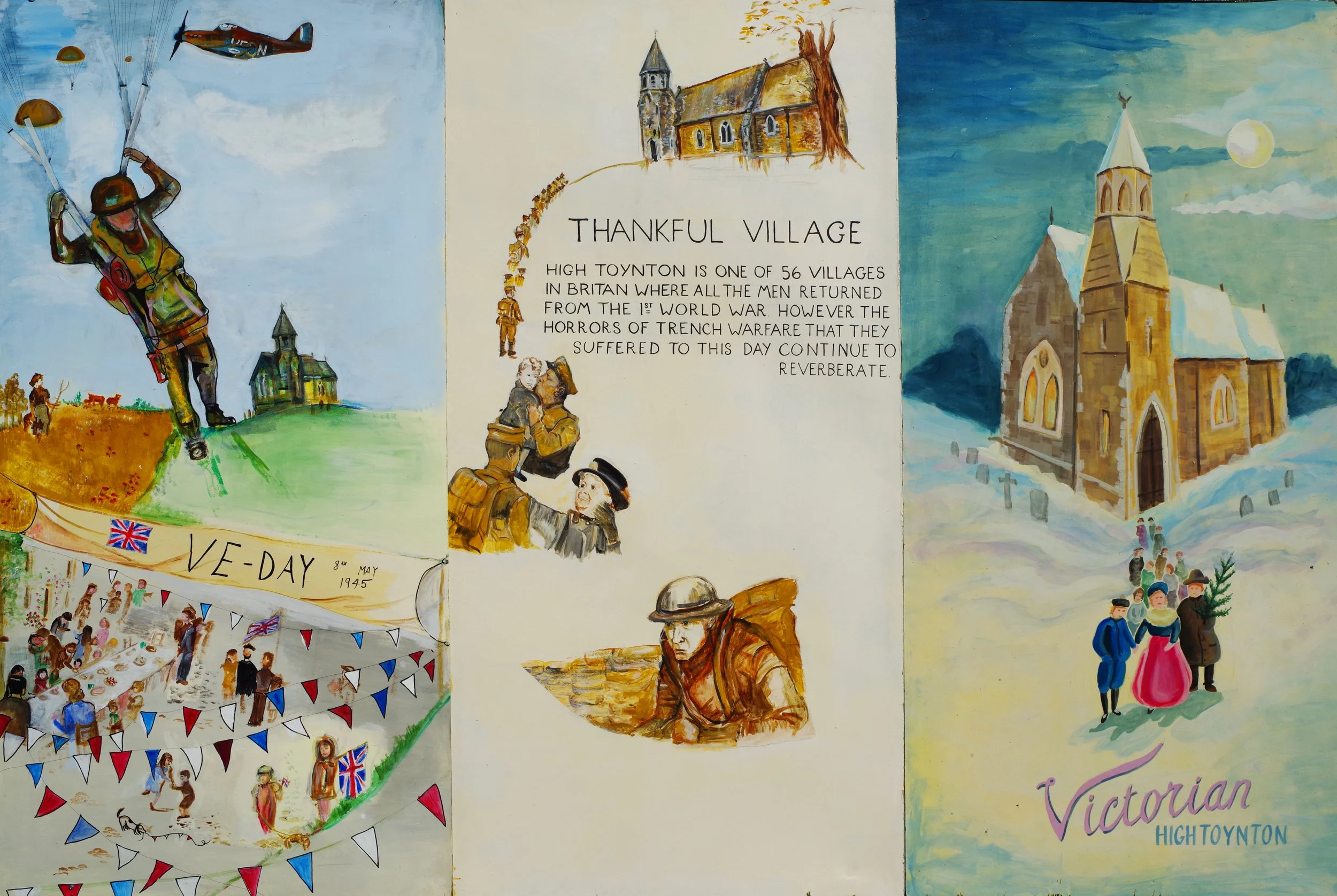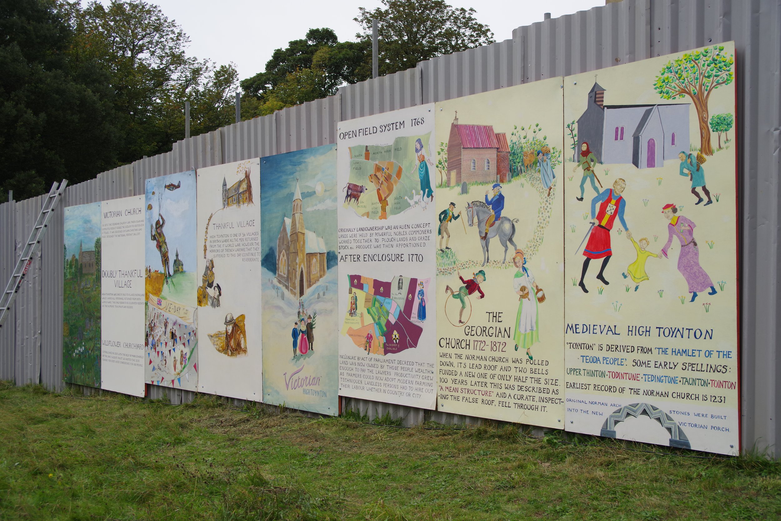 In 2020 the church tower collapsed. The villagers had to arrange for scaffolding to support the remainder of the church and to surround the building with hoardings to prevent access. The hoardings were corrugated metal and looked rather barren. The villagers then decided to make and paint 8’ by 4’ murals to brighten up the appearance and also tell the history of the village and church. The photos show the murals in position (above) and also in close up in groups of three to tell the story.